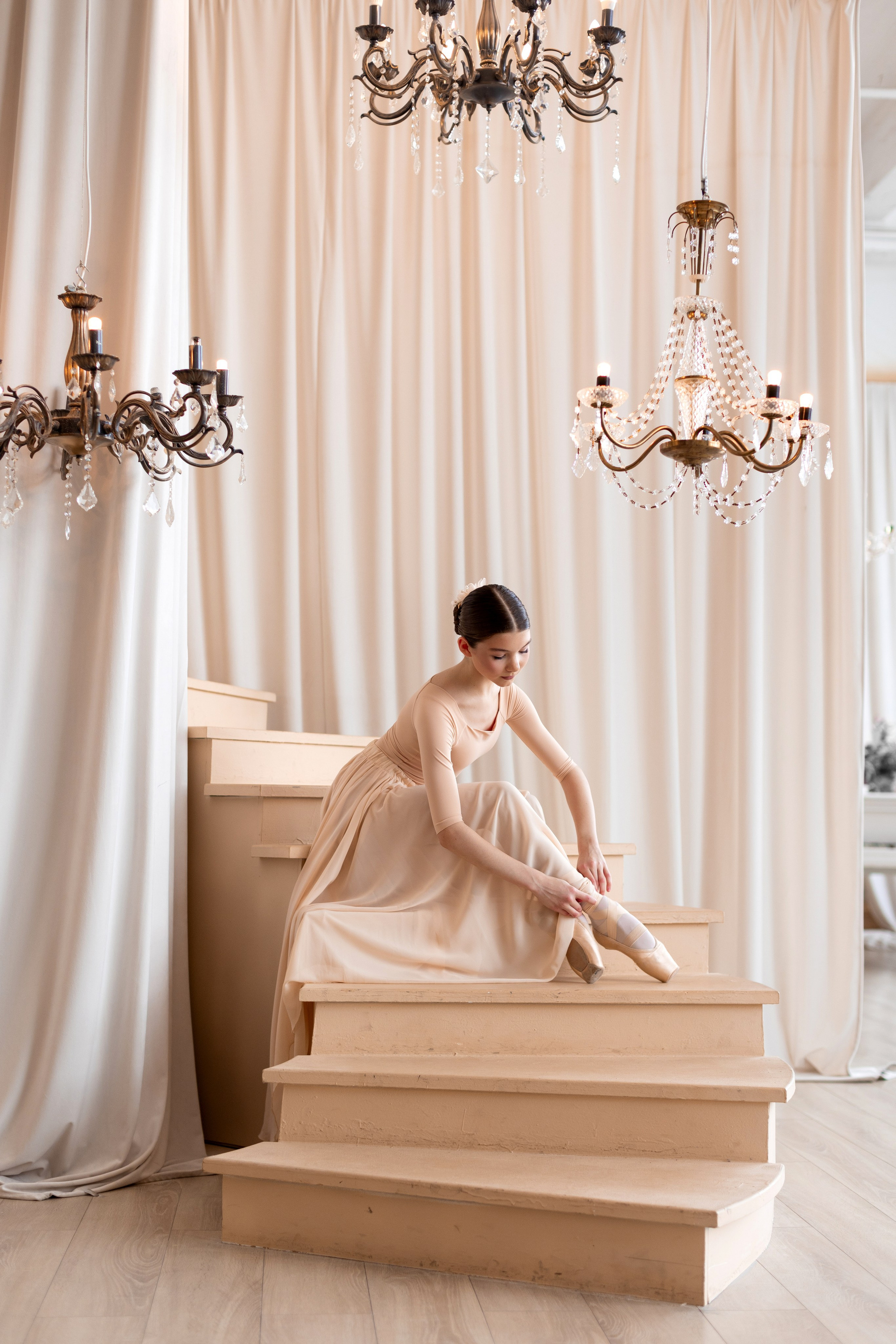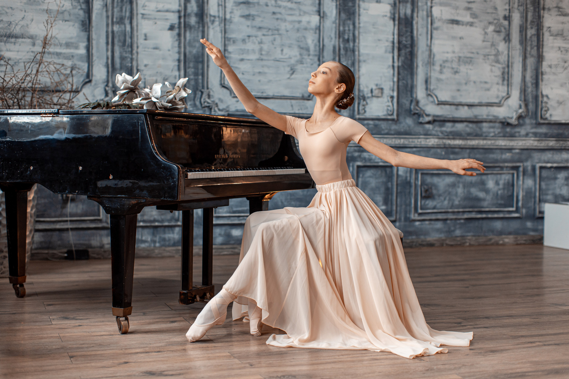 Бежевая воздушная юбка предоставляется напрокат бесплатно при заказе фотосъёмки. Балетный фотограф Алина Ханько. Душа Балета